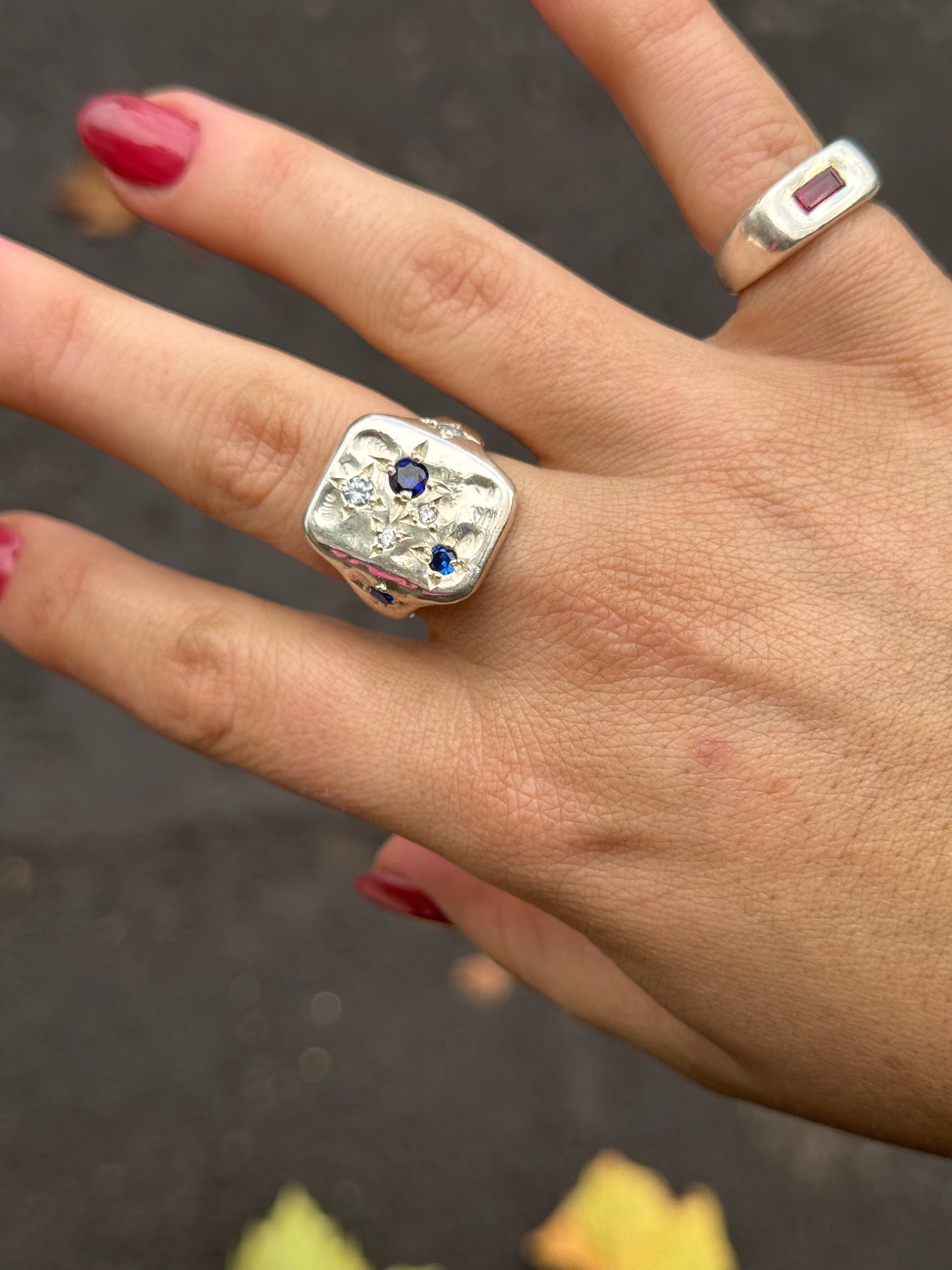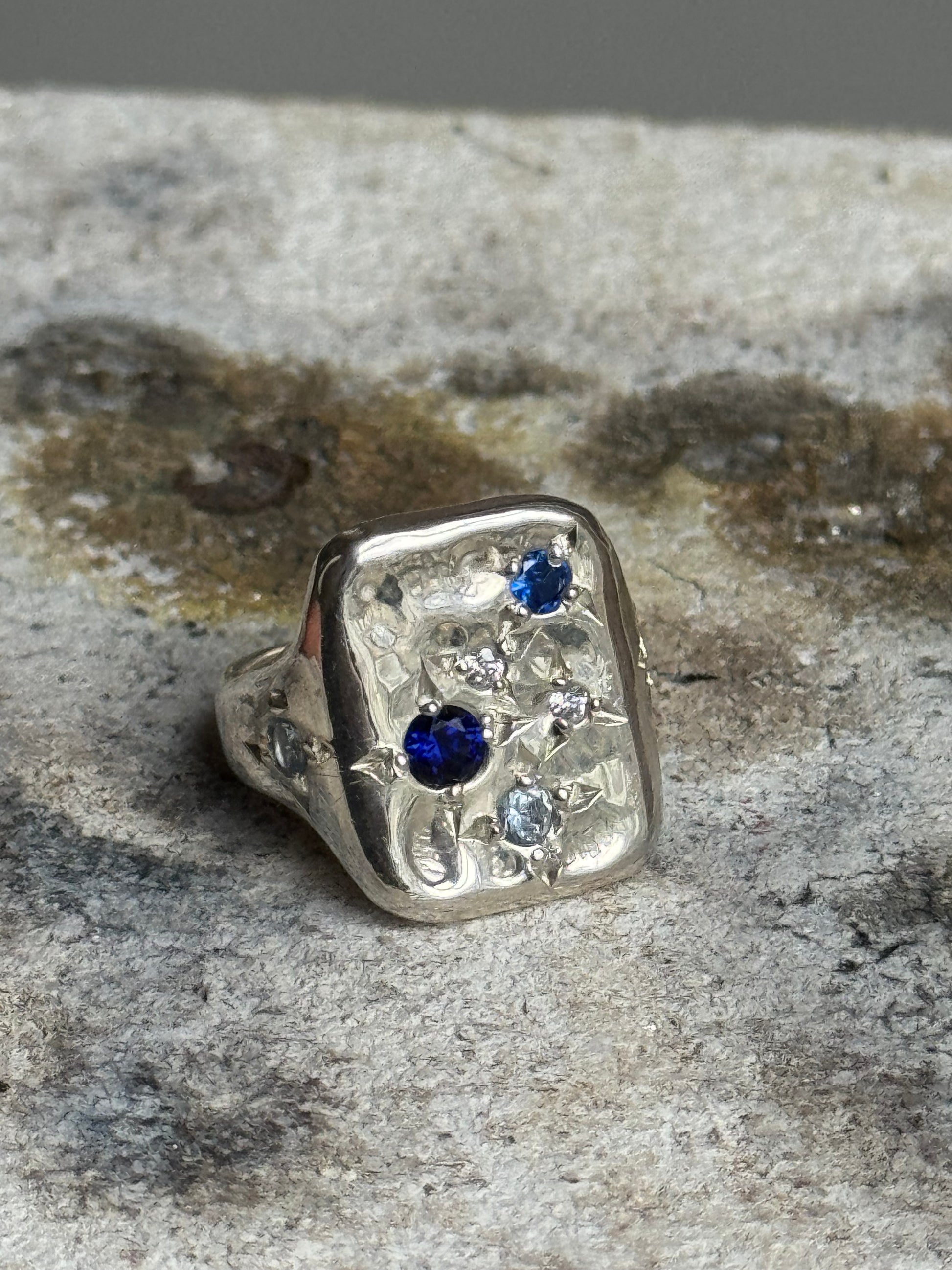The blue tablet ring is made with cubic zirconia, and lab grown sapphires - email or dm for natural stones options.