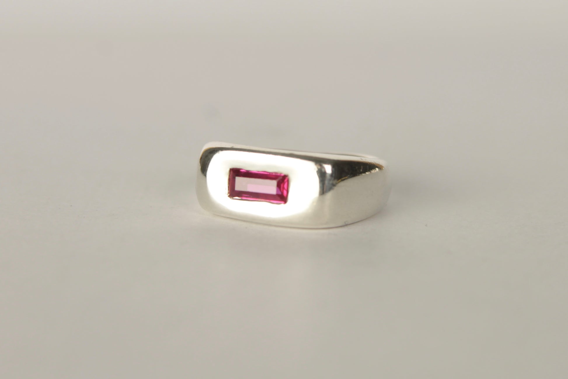 Hand-carved and cast ring featuring a flush-set ruby, made to order in Edinburgh using 100% recycled silver.