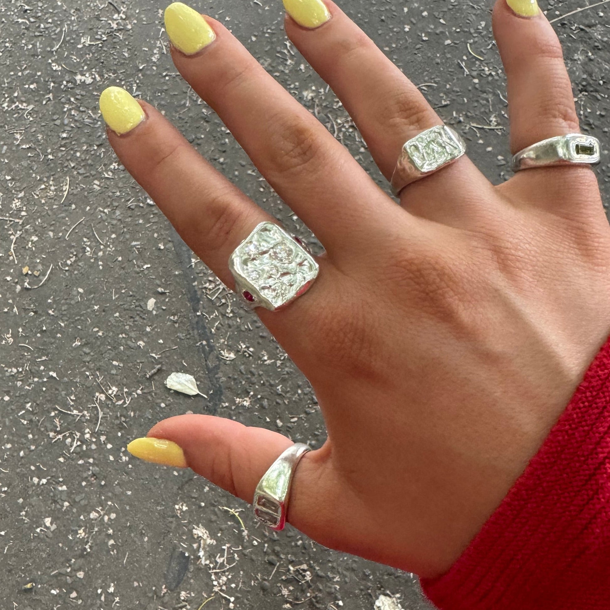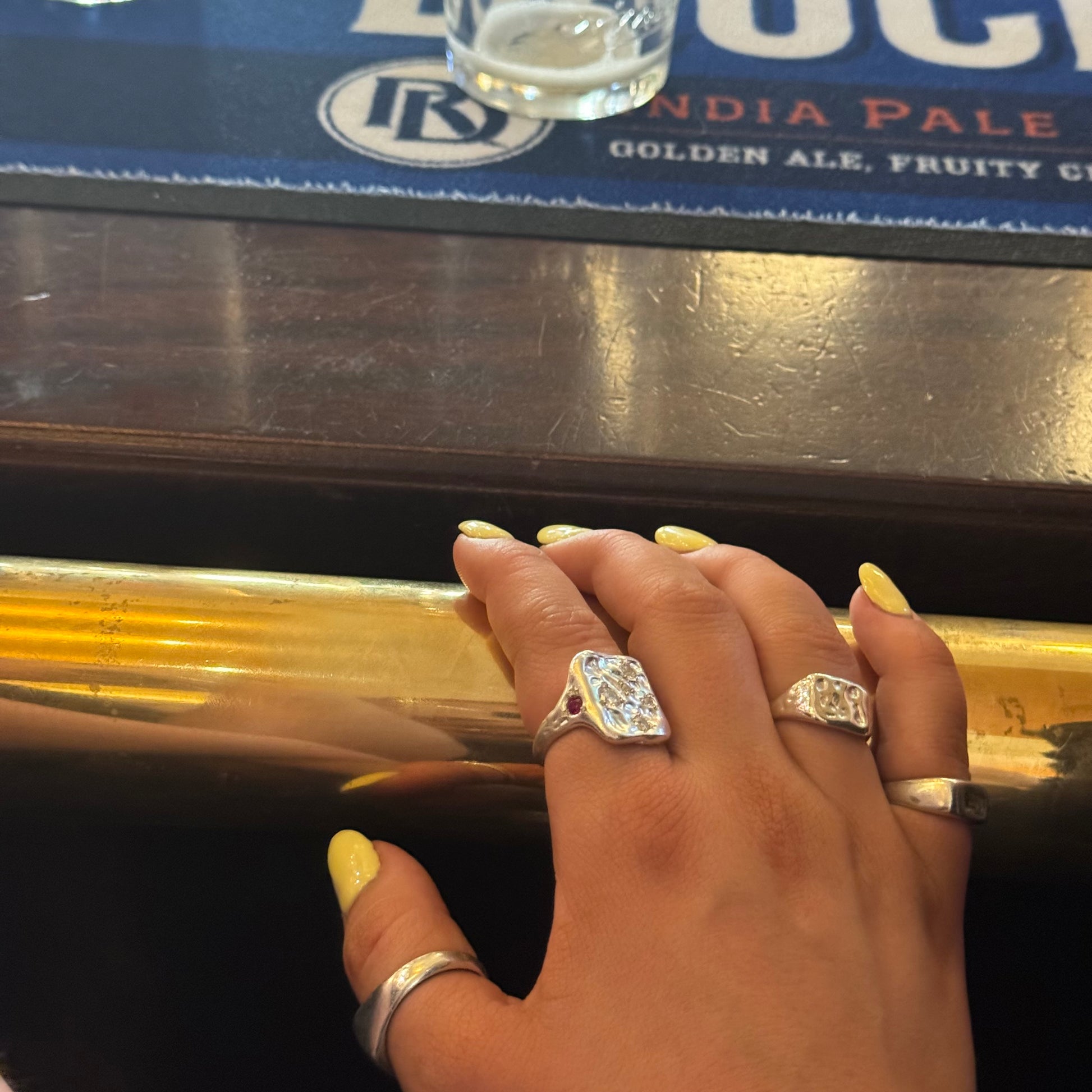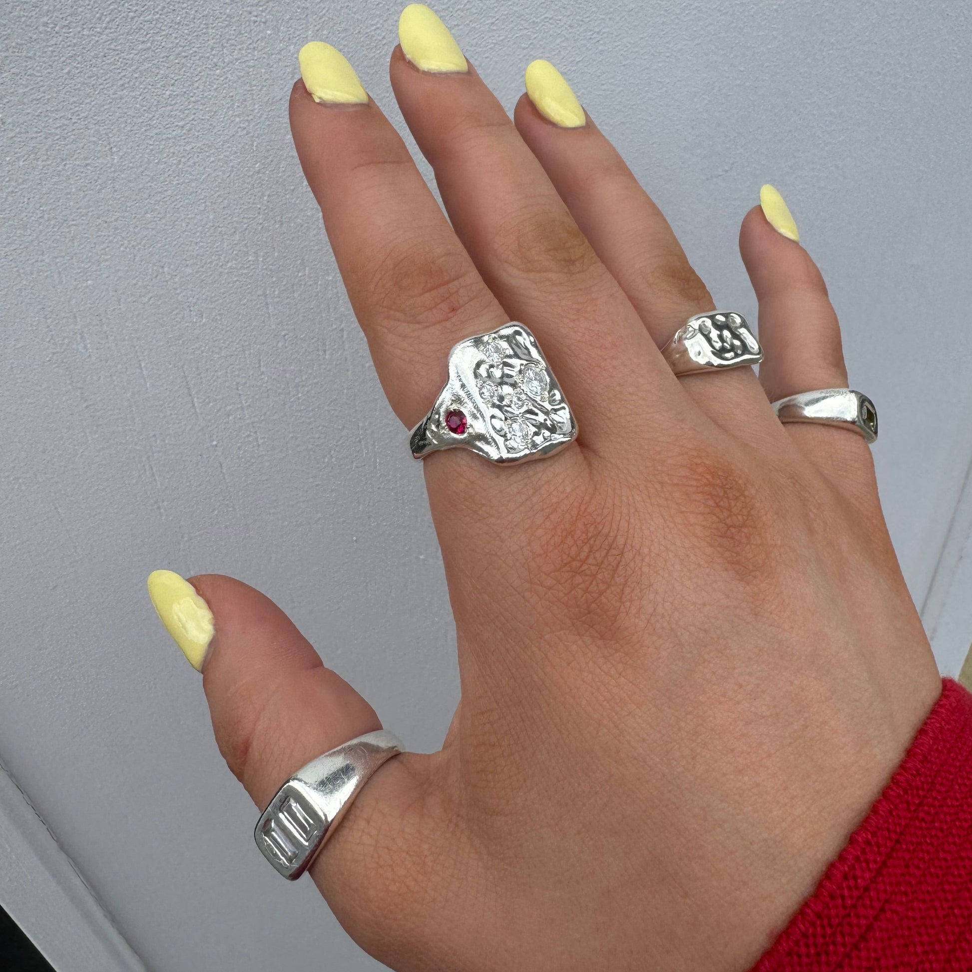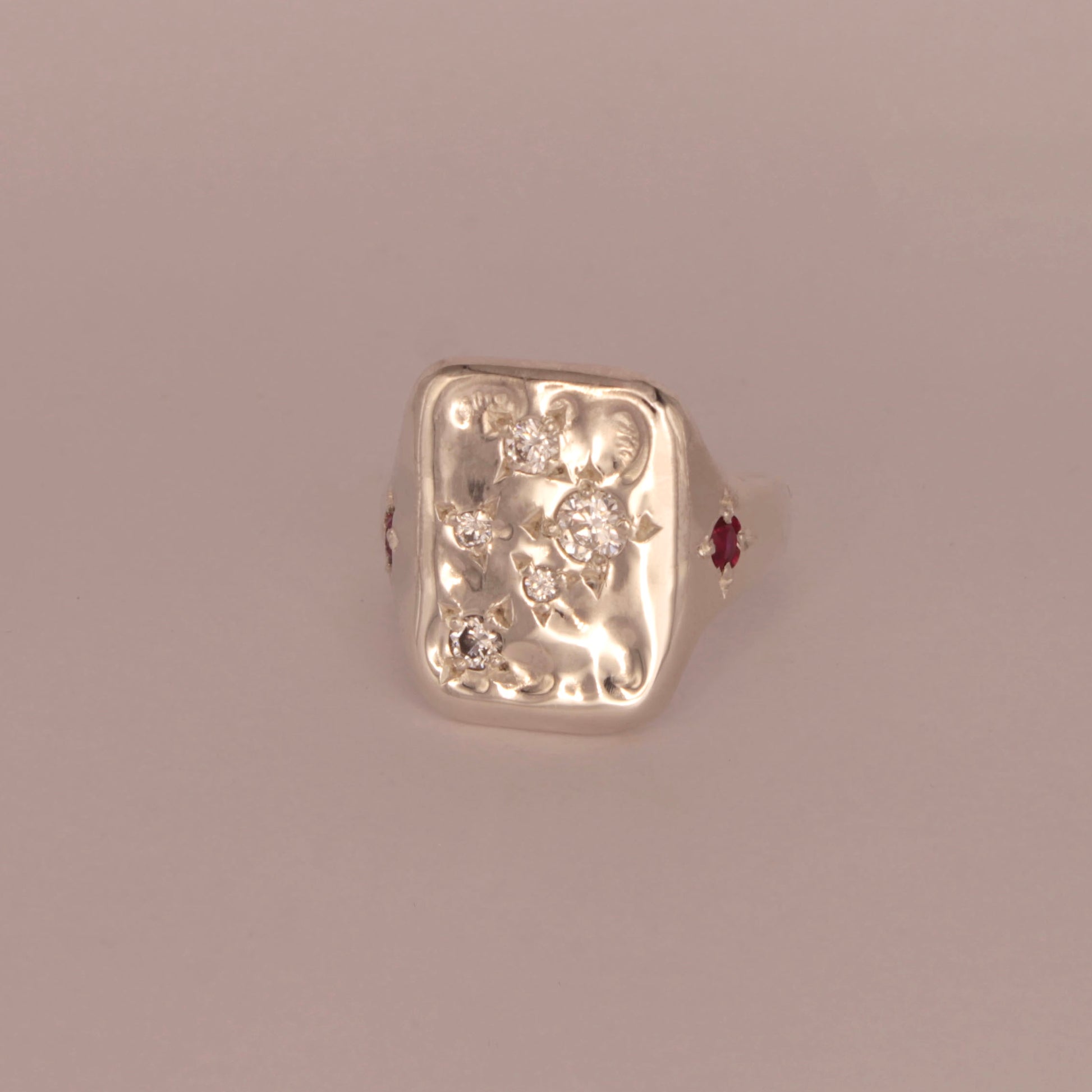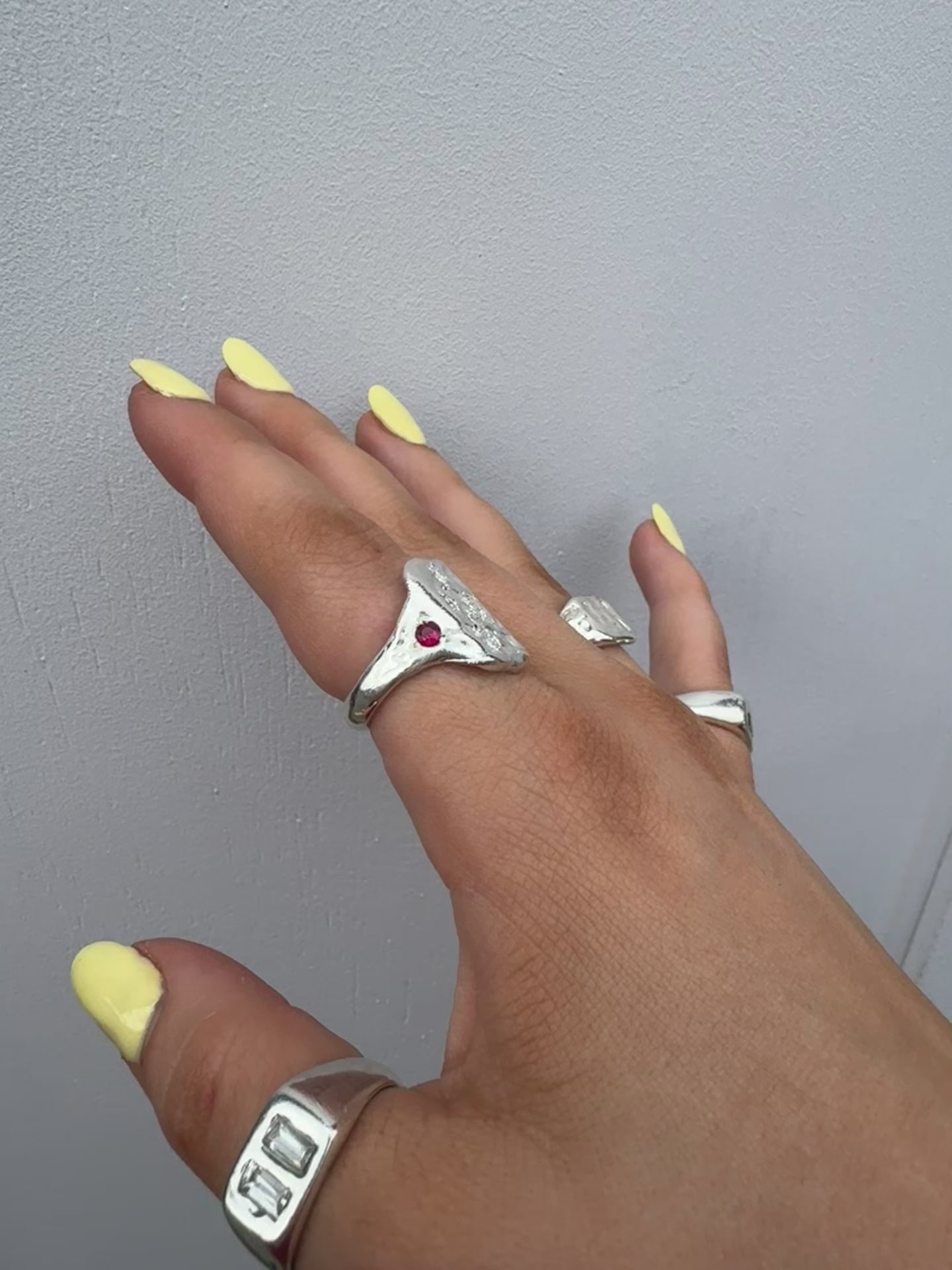 The tablet ring is made a white cubic zirconia, and lab grown rubies - email or dm for natural stones options.